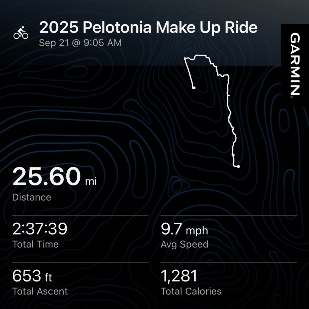 Despite a couple of hiccups along the way, I am pleased to report that my make up ride for Pelotonia 2025 was successful. The ride took place on September 21, starting at Bridge Park in Dublin, OH and finished at North Bank Park in Downtown Columbus. Despite all of the preparations and testing, the live tracking from Garmin did not work at all during the ride. While that was disappointing, I’m hoping to have that fixed in time before I start on-bike training next spring.